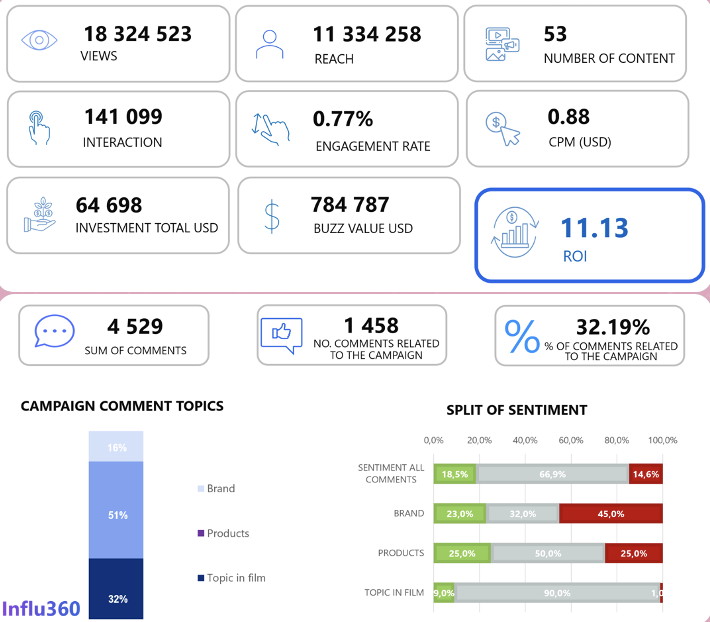 Obliczamy potencjalną wartość medialną (buzz value) postów i rolek. Sprawdzamy, jaki % publikacji twórcy to treści reklamowe, a ile organiczne. Korzystamy z aplikacji INflu360. Tworzymy plany kampanii z szacowanymi parametrami mediowymi: wartość buzz (zł), liczba wyświetleń, poziom zaangażowania i zasięg.
